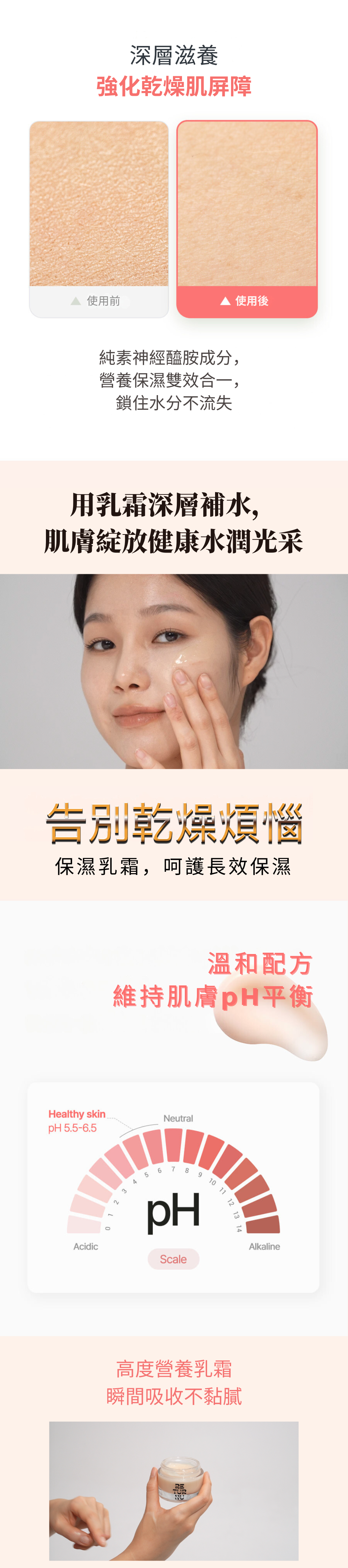 乾燥肌膚:專為極度乾燥、缺水肌膚設計,深層保濕,改善肌膚粗糙、脫皮等問題。