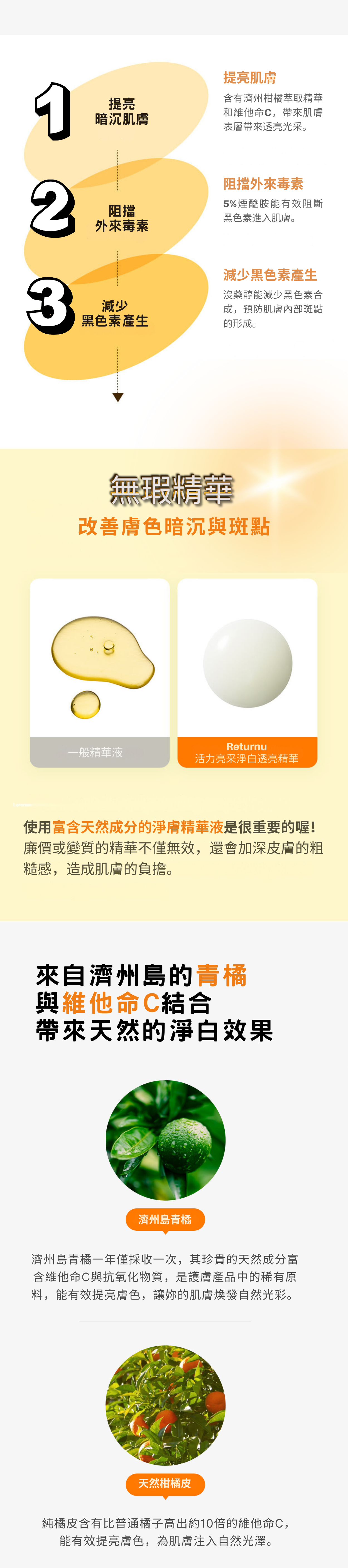 - 濟州青柑奇蹟:天然成分提亮膚色,改善暗沉無負擔。